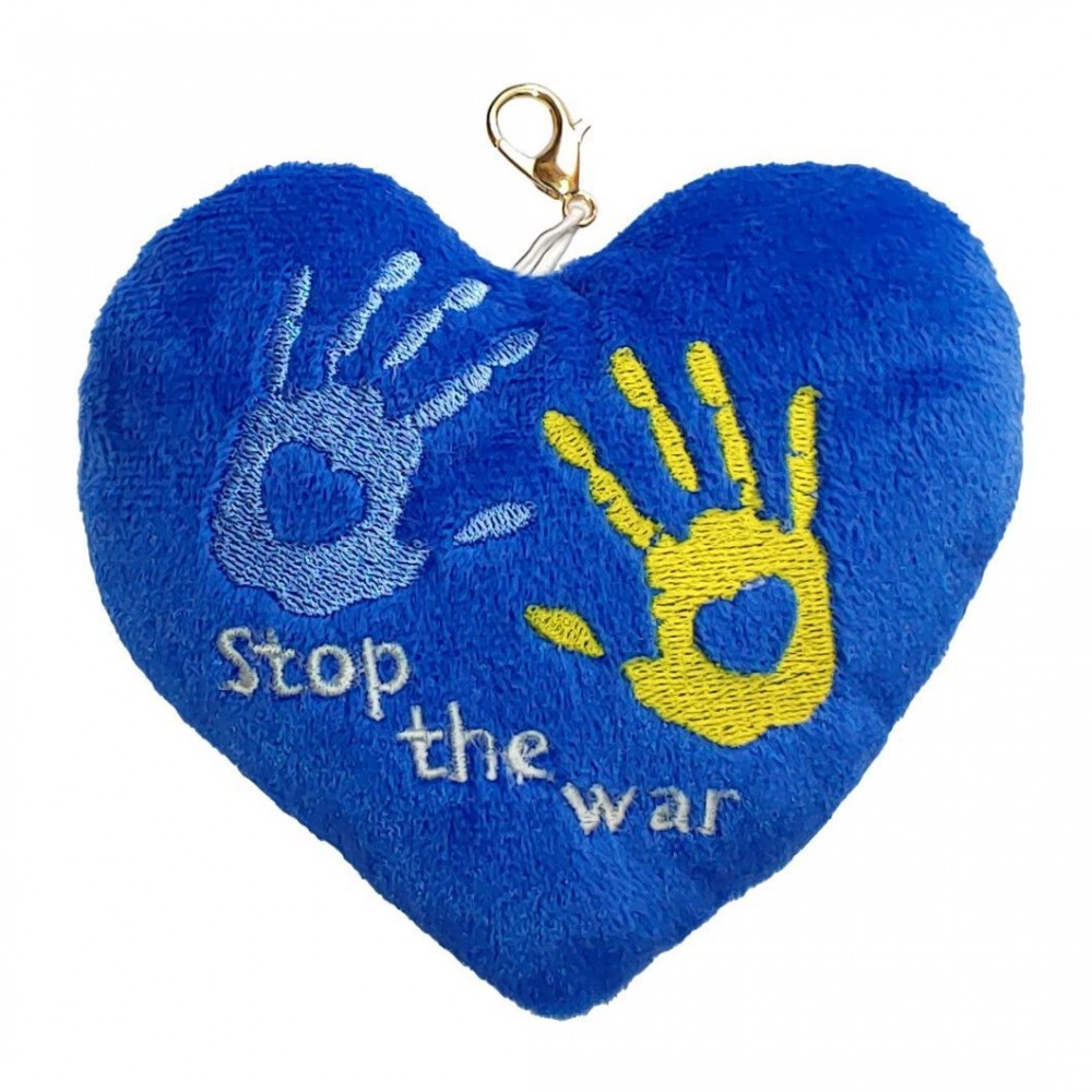 Мягкий брелок в форме сердца. Выполнен с надписью "Stop the War" и изображением ладоней в цветах флага Украины. У брелока небольшой карабин за который его легко можно прикрепить к ключам или рюкзаку. Размер 12х10х4 см.