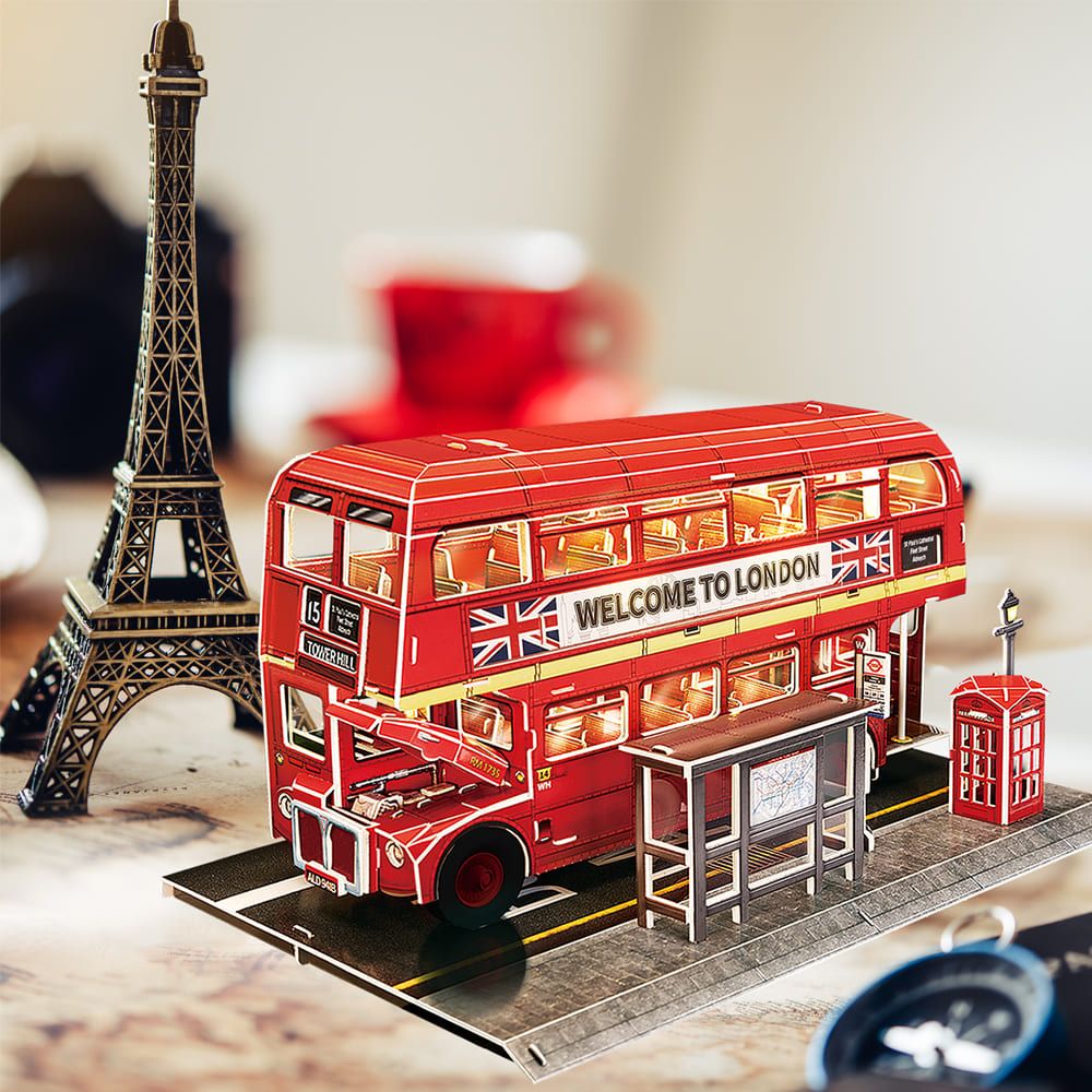 CubicFun Тривимірна головоломка-конструктор з LED підсвіткою «Лондонський автобус» сподобається юним архітекторам. Лондонський двоповерховий автобус – це живий символ міста, який переносить у минуле та одночасно в майбутнє. Стукіт коліс, гул мотора, та чудовий вид з верхнього ярусу – це справжній досвід Лондона. Розмір готової моделі становить 32.7 x 22.5 x 17.5 см. Для живлення потрібні 2 батарейки типу AАА (немає в комплекті). Рекомендовано для дітей від 8-ми років.
