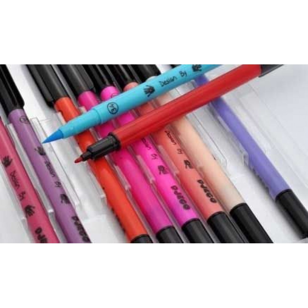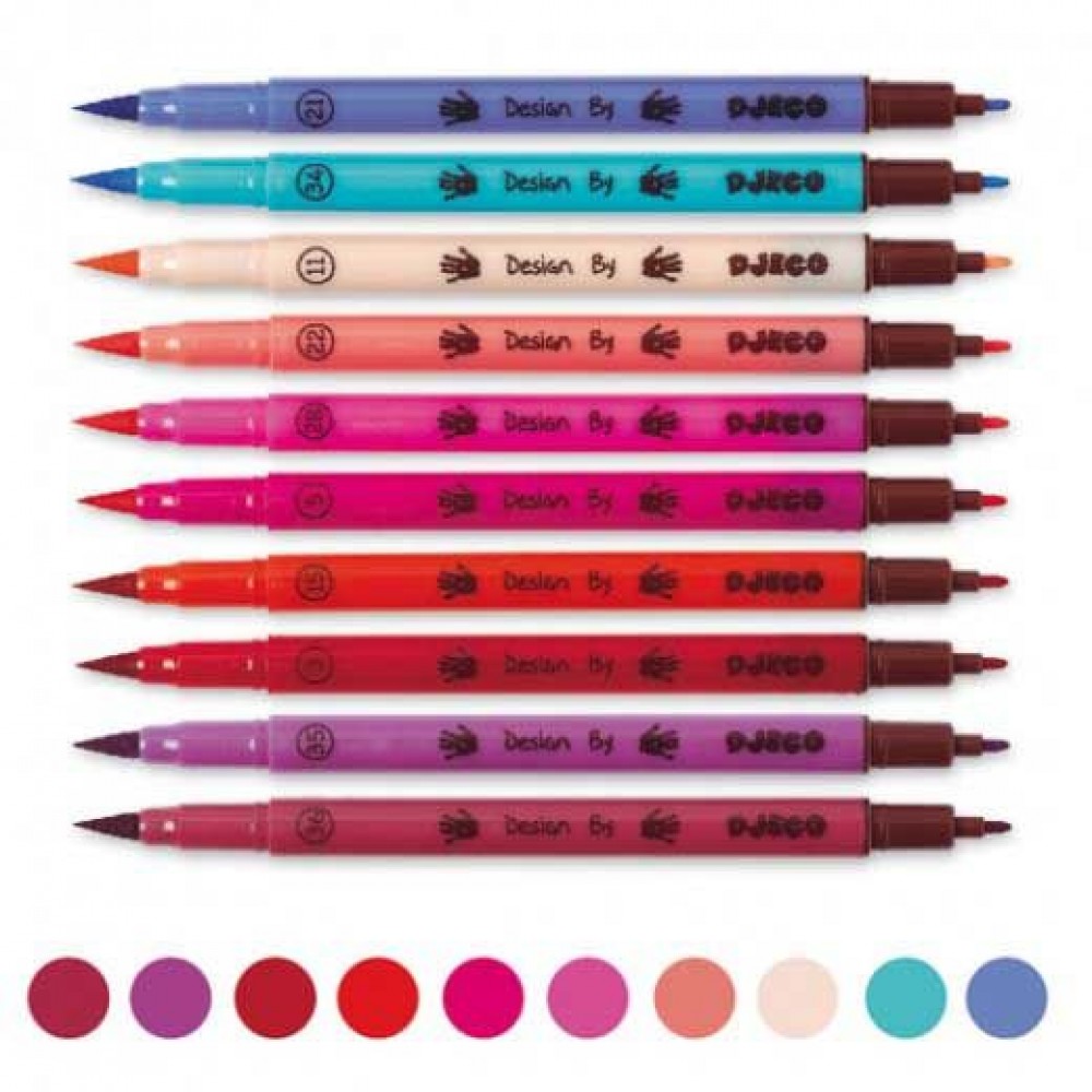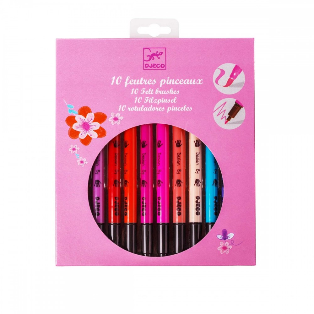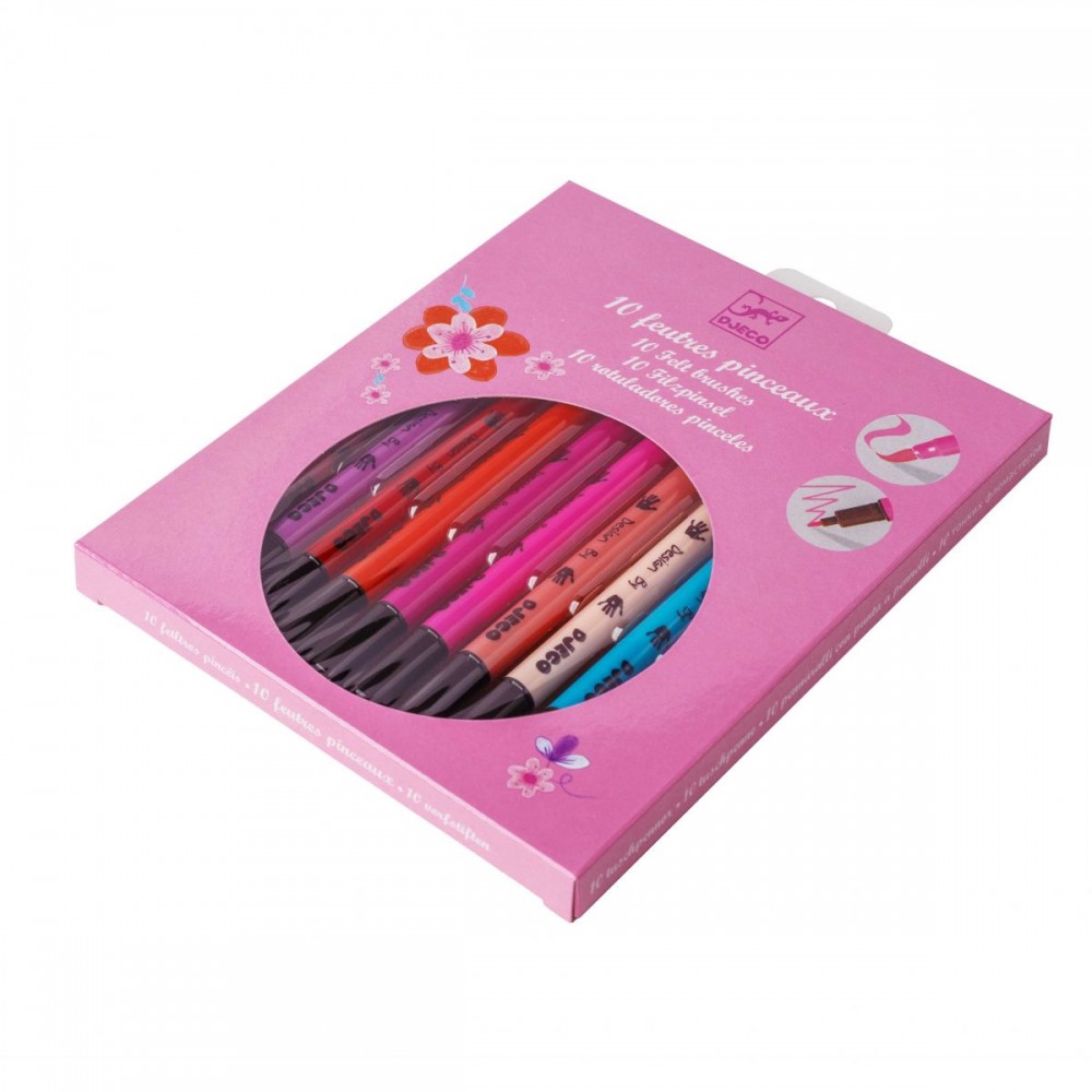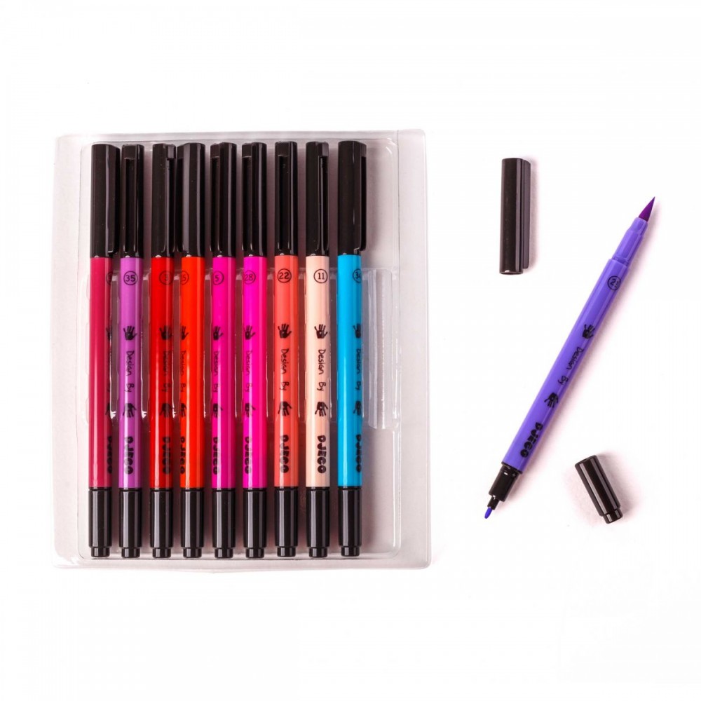 В наборе 10 штук двусторонних фломастеров пастельных тонов. С одной стороны - для тонких линий, с другой стороны - фломастер в виде кисточки для более мягких штрихов.
