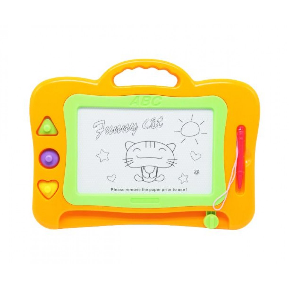 Яркая пластиковая доска для рисования с магнитной основой. В наборе: магнитная ручка и 3 печати (в форме сердца, круглая, треугольная). Готовый рисунок можно стереть, потянув за бегунок внизу доски. Размер поля для рисования - 17,5 х 11 см.