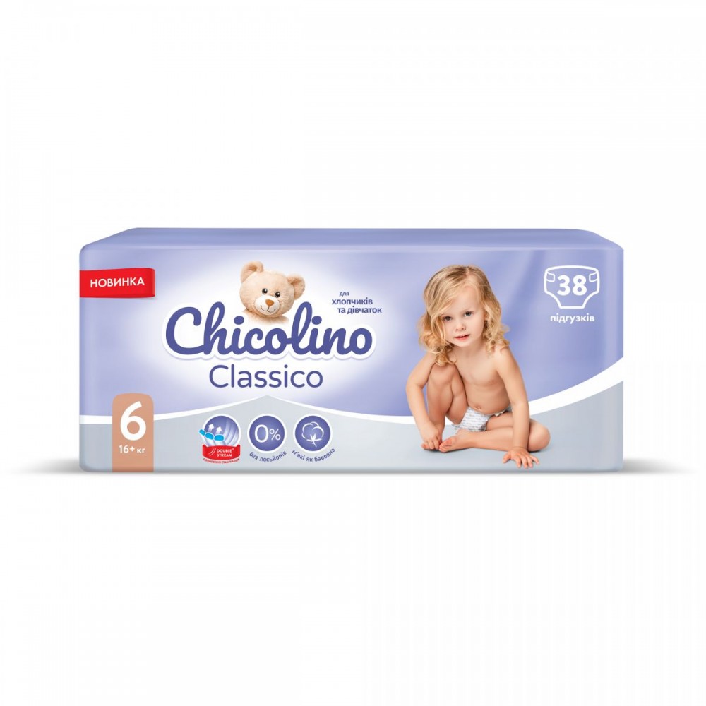Комфорт, безопасность и инновации – именно то, что вы найдете в каждом подгузнике Chicolino. Мы позаботились, чтобы гигиенические процедуры занимали меньше времени у озабоченных родителей. Подгузники Chicolino Сlassico – новый дизайн, новое качество! Они подходят для активных игр и сна малышам: ● созданы из сертифицированного европейского сырья наивысшего качества ● имеют усиленные барьеры, надежно защищающие от протечек ● современный распределительный слой с продольной стабилизацией - моментально распределяет влагу и предупреждает образование комков ● удобные эластичные ● подгузников гипоаллергенен и не вызывает раздражений. В подгузниках Chicolino кожа вашего малыша всегда остается сухой и сохраняет естественную нежность. Революционная технология впитывания Double Stream обеспечивает равномерное поглощение и распределение жидкости внутри. Тратьте каждую лишнюю минуту на игры с малышом, а не на заботы о гигиене. Выбирайте свой комфортный размер упаковки и получайте еще больше ночной заботы для ваших малышей. Родители, удачно балансирующие между воспитанием малыша, работой, бытом и хобби, выбирают подгузники Chicolino. Идеальная мягкость, лаконичный дизайн и ничего лишнего. Chicolino – оптимальный выбор подгузников для активных малышей на каждый день.