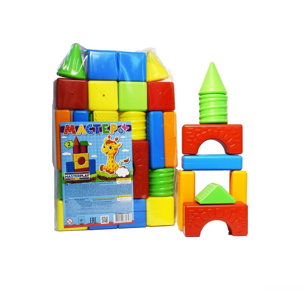 Конструктор "Мастерок", 15 геометрических форм из которым ребёнок сможет построить различные сооружения вроде замков, стен и башен. Изготовлено из качественных и безопасных материалов.