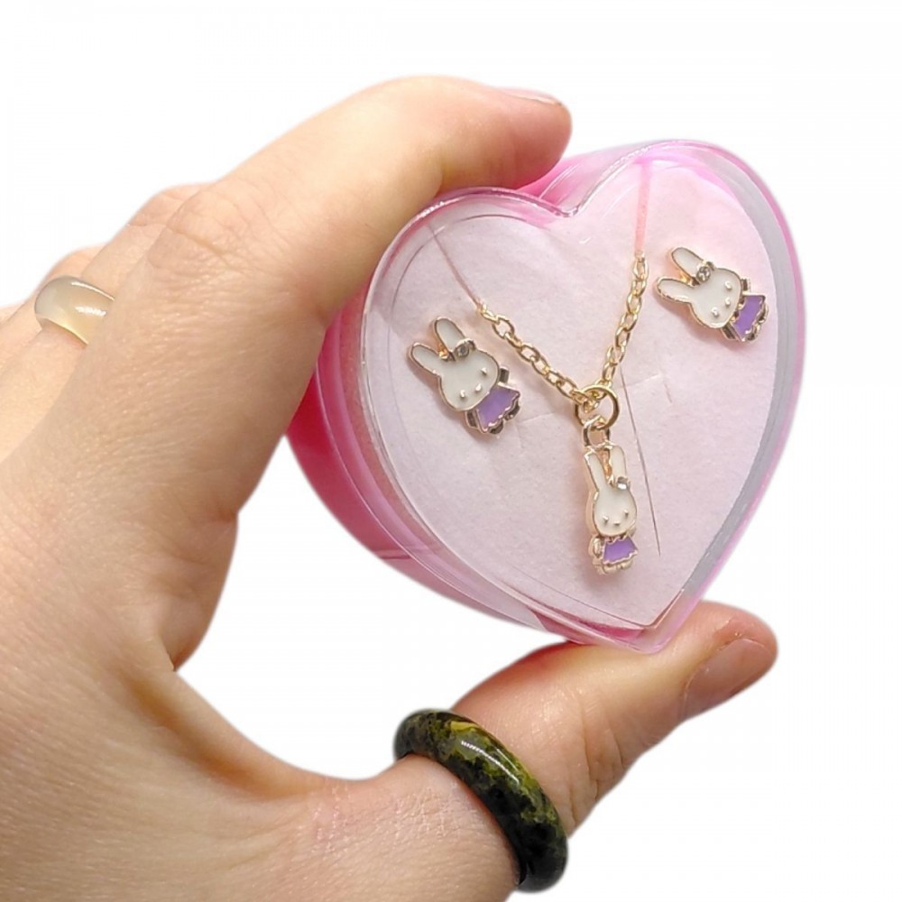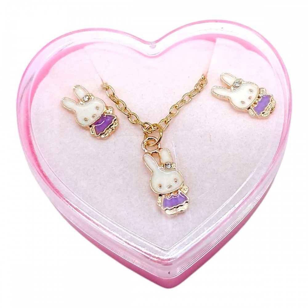 Детский набор украшений – милый комплект, в который входят кулон на цепочке и пара серьг с милым изображением. Этот аксессуар станет отличным дополнением детского образа, придает нежности и игривому настроению. Изображения на украшениях – яркие, выполненные в приятной цветовой палитре, благодаря чему набор заметен. Подходит как подарок — будь то на праздник или просто для радости. Материалы – типичный легкий сплав и декоративное покрытие, поэтому ухаживать следует осторожно: избегать контакта с водой и химикатами, чтобы цвет и блеск сохранялись дольше. Укомплектовано в милую коробочку в форме сердечка с прозрачной крышкой. Рекомендовано для детей старше 3-х лет.