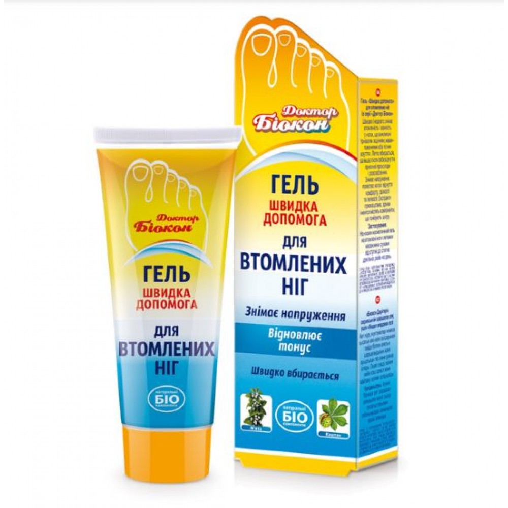 Гель для усталых ног Доктор Биокон Скорая помощь быстро и надолго снимает усталость и тяжесть в ногах, вызванную длительной ходьбой, нагрузками или тесной обувью. Снимает напряжение, возвращает ногам чувство комфорта, свежести и воздушности. Экстракты конского каштана, арники и ментол содержат компоненты, тонизирующие кожу. Способ применения: наносить на уставшие ноги легкими массирующими движениями от ступни до бедра несколько раз в день. Состав: вода, каприлик/каприк триглицериды, циклометикон, мочевина, ПЭГ-1500, ментол, карбомер, ментиллактат, бис-ПЭГ-18 динатрий ЭДТА, боа, бронопол, пропилпарабен.