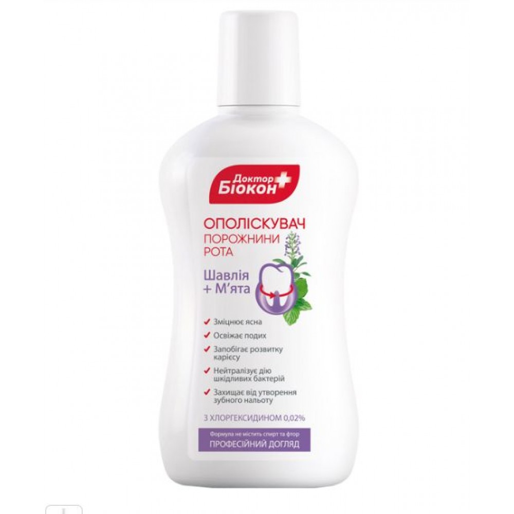 Рекомендован для ежедневного профессионального ухода за полостью рта. Действие антибактериального и дезинфицирующего компонента хлоргексидина, а также эфирных масел шалфея и мяты направлено на борьбу с бактериями и укрепление десен. Ополаскиватель хорошо очищает зубоясенные карманы и межзубные промежутки. Устраняет неприятный запах изо рта, освежает дыхание, препятствует образованию зубного налета.