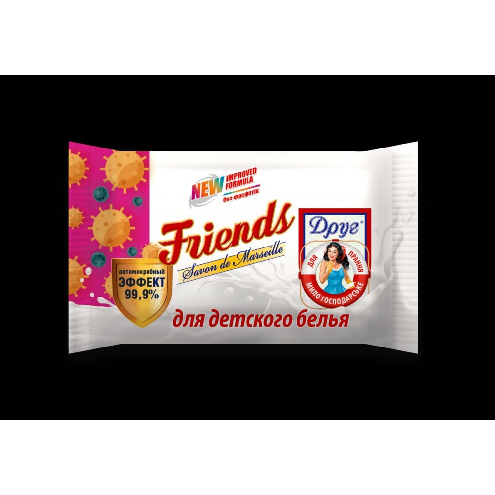 Уникальная формула специально разработана научно-производственной лабораторией предприятия, содержащей специальные добавки направленного действия, обеспечивающие четырем видам мыла ярко выраженные свойства: отбеливание, удаление пятен, бережное действие на деликатные ткани и кожу рук, специальные свойства для эффективной стирки детского белья. Хозяйственное мыло Друг создано из высококачественного сырья растительного происхождения. Все виды линейки содержат приятные парфюмерные композиции, придающие белью аромат чистоты и свежести. Создано с учетом специфки стирки детского белья, в его состав входит дополнительный оптический отбеливатель, а также добавка, обладающая дезинфицирующим свойством. Мыло легко выполаскивается. Белье, постиранное хозяйственным мылом Friends, не раздражает нежную кожу ребенка.