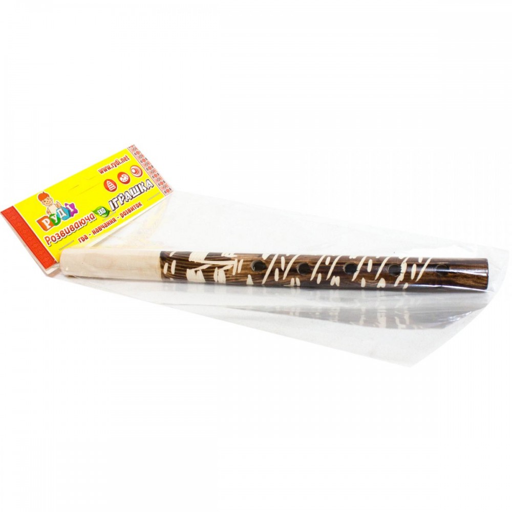 Яркая дудочка с интересной резьбой. Изготовлена из дерева (сосна, бук). Имеет 5 нот. Размер дудочки: 25 см.