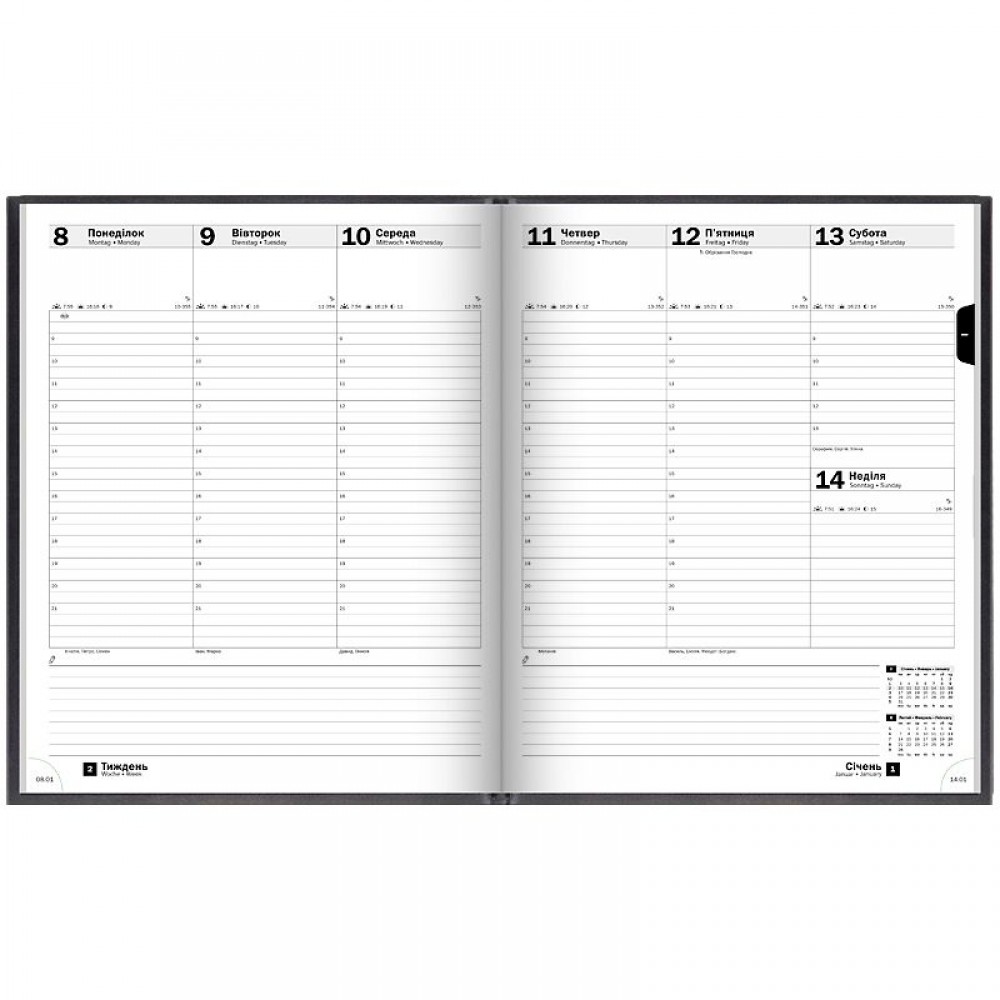Еженедельник Brunnen 2026 Бюро – статусная модель для тех, кому важно детальное планирование дел. Особенности: Три языка: украинский, английский, немецкий. Формат А4 с разворотом недели. Две страницы – одна неделя. Общее количество страниц – 152. Европейская белая бумага 100 г/м2. Страницы общего планирования на год. Информационный блок. Алфавитная записная книжка. Органайзер времени с 09:00 до 21:00. Изысканные кремовые форзацы. Печать серого цвета. Дополнительные страницы с перфорацией. Отрывные датированные уголки и закладка-ляссе. Эффектная черная обложка Torino с лаконичным слепым тиснением.