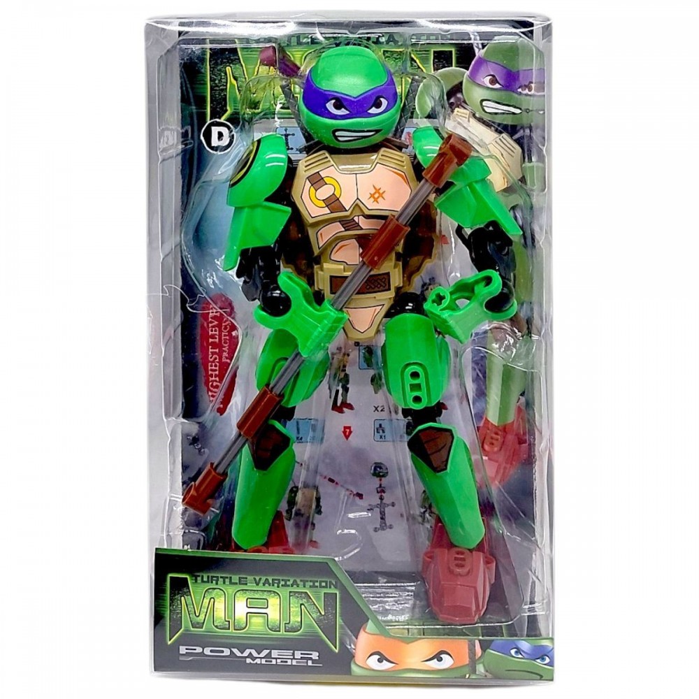 Игровая фигурка выполнена в стиле известного героя из серии «Ракушки Ниндзя». Модель имеет характерные черты персонажа – зеленое тело, защитные элементы, фиолетовая повязку и оружие.