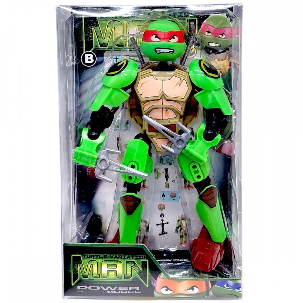 Игровая фигурка выполнена в стиле известного героя из серии «Ракушки Ниндзя». Модель имеет характерные черты персонажа – зеленое тело, защитные элементы, красную повязку и оружие.