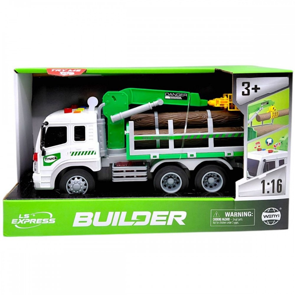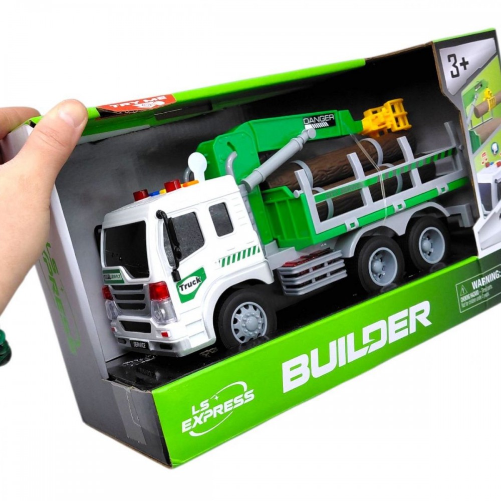 Грузовая машинка оснащена фрикционным механизмом: для запуска достаточно откатить ее назад и отпустить. Кузов содержит декоративные элементы в виде бревен, а на платформе расположен манипулятор для имитации загрузки.