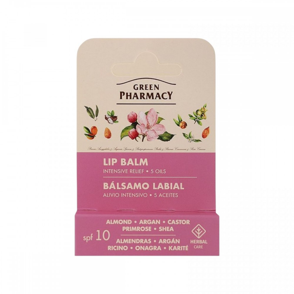 Бальзам для губ интенсивно увлажняющий с 5 маслами от Green Pharmacy Нежная кожа губ страдает от перепада температур, ветра, мороза или палящего солнца, мы имеем прекрасное средство для эффективного ухода. В состав бальзама входят 5 растительных масел: аргановое масло, масло ши, миндальное масло, касторовое и примулы вечернее. Обогащен витамином Е. Интенсивно увлажняет, питает, предотвращает потерю влаги и растрескивание кожи губ. Обеспечивает эффективную защиту от ультрафиолетового излучения летом и успокаивает зимой, предотвращая сухость и микротрещины. Нежный аромат розы – дополнительное удовольствие от использования бальзама. Активные комоненты: ◊ Аргановое масло богато жирными кислотами (омега-6 и омега-9) и витамином E, которые помогают восстановить сухие и потрескавшиеся губы; ◊ Масло ши (карите) – содержит природный SPF, помогающий защитить губы от ультрафиолета; ◊ Миндальное масло содержит витамины A, E, F, которые способствуют регенерации клеток; ◊ Касторовое масло – одно из лучших масел для смягчения сухих губ, помогает восстановить губы после обветривания; ◊ Масло примулы вечерней – имеет антивозрастной эффект – способствует регенерации клеток, предотвращает старение губ. Благодаря использованию бальзама Вы обеспечите интенсивное питание, защиту, заживление и увлажнение губ, делая их мягкими, гладкими и ухоженными.