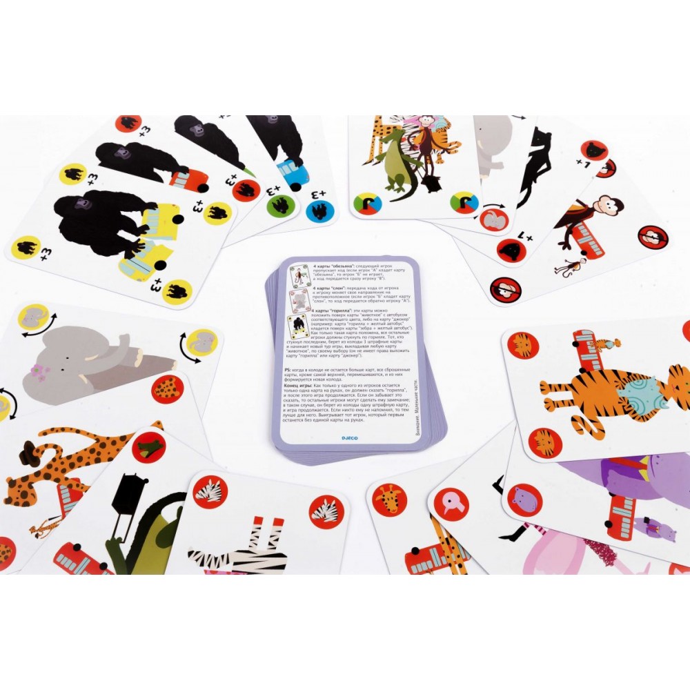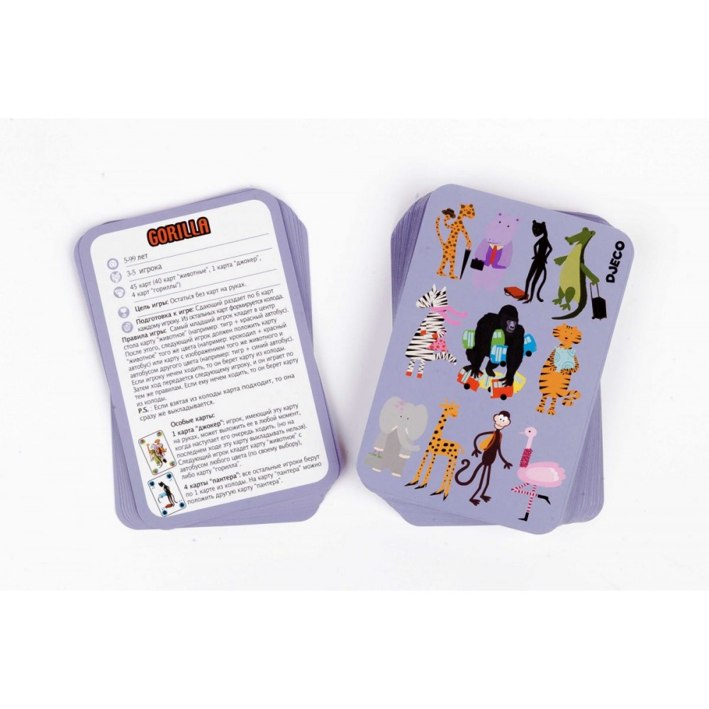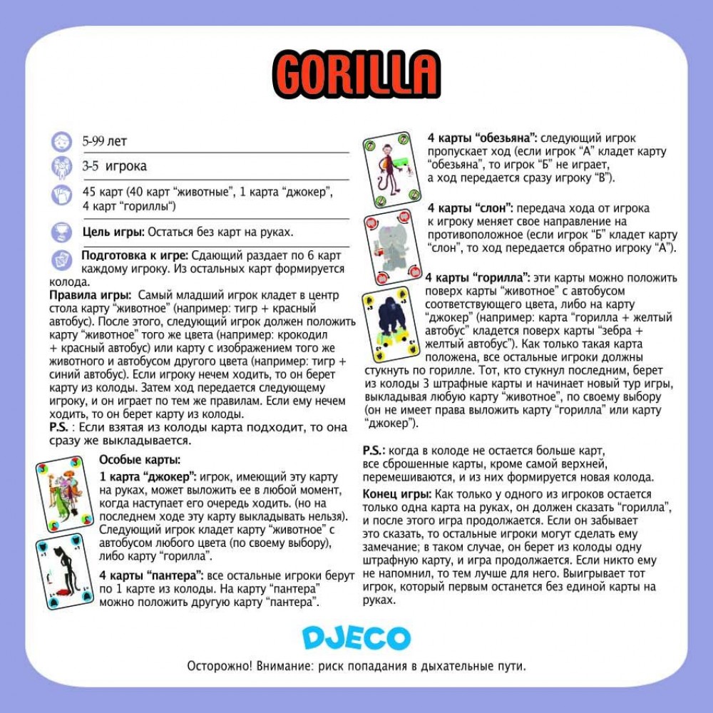 Согласно правилам, первый Игрок кладет карту с изображение животного и автобуса. Следующий Игрок должен положить карту с сохранением того же животного и автобуса того-же цвета или с изображением того же животного, но с автобусом другого цвета. В колоде есть особые карты, какие требующая своих вопросам коммерческой торговли шагов. Настольная игра Горилла способствует развитию памяти, образного мышления, логики, посидючости и внимательности у ребенка. Цель игры: Оставить без карт на руках.