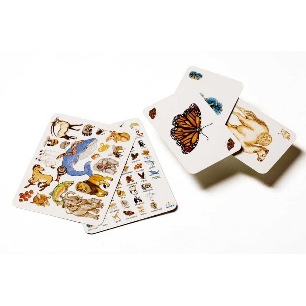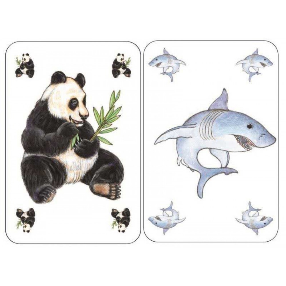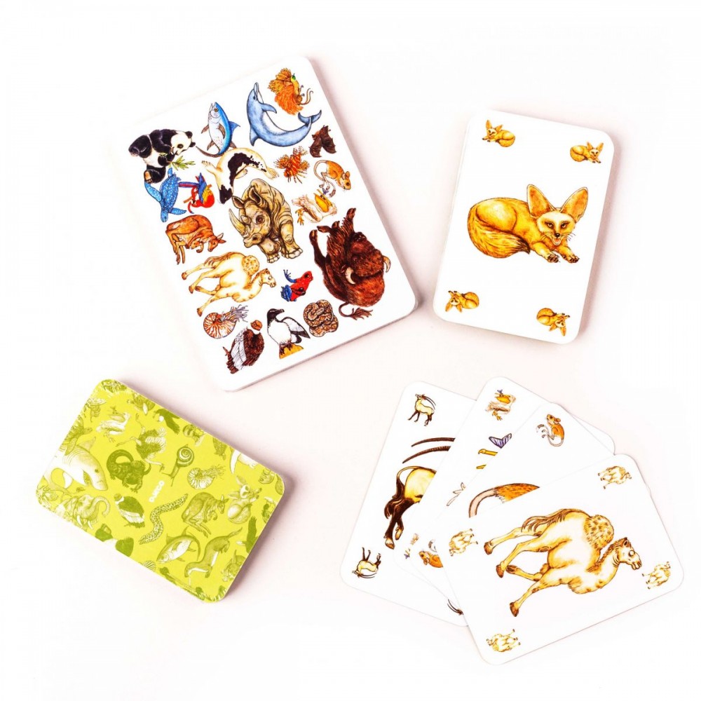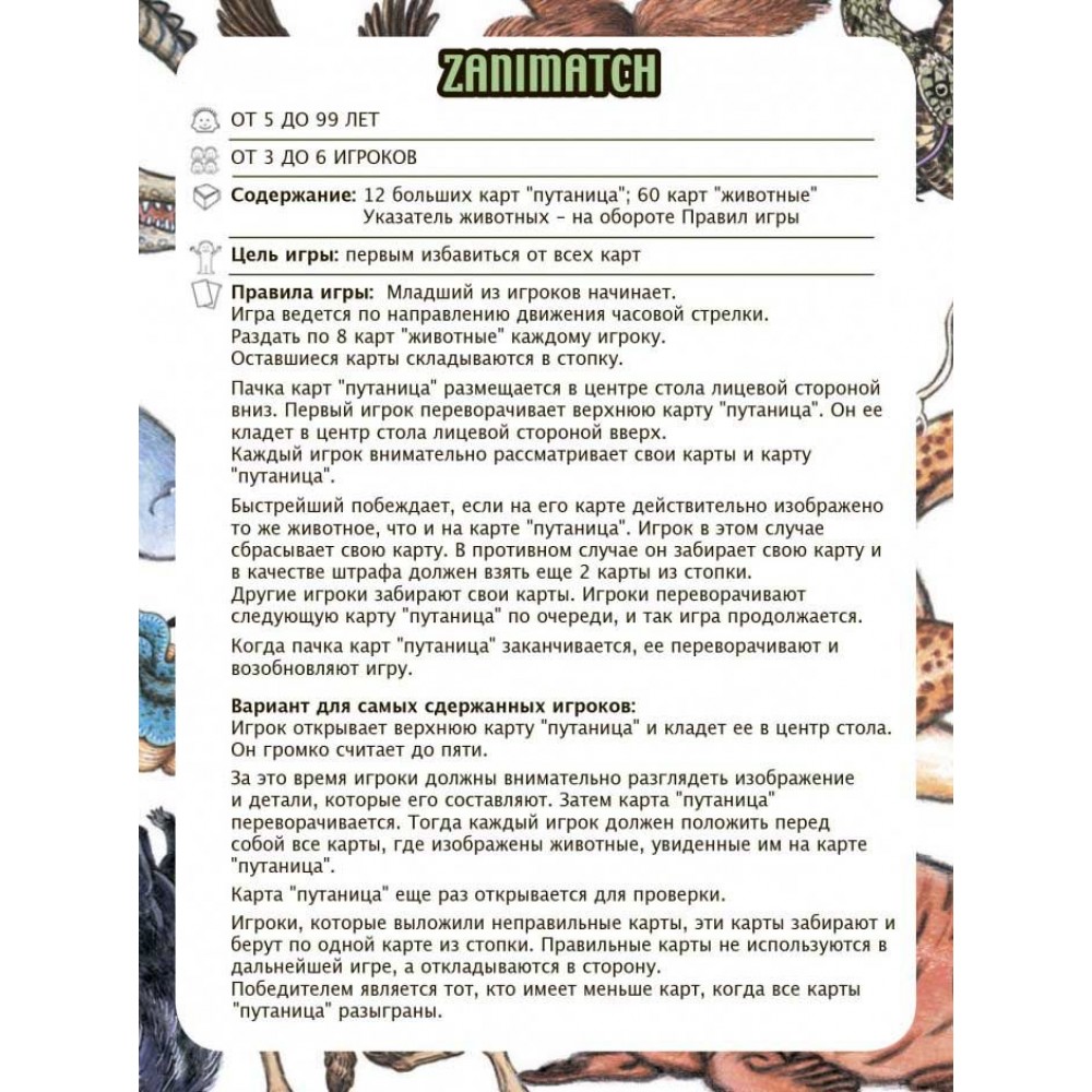 Веселая детская карточная игра. Игрокам раздаётся по 8 карт животные. Открывая по очереди большие карты путаница игроки стараются как можно быстрее избавиться от своих карт с изображением животных. В случае ошибки игрок добирает дополнительные карты из колоды.Побеждает игрок с наименьшим количеством карт после открытия всех больших карт путаница. Игра развивает быстроту реакции, наблюдательность и сообразительность. Помогает изучать животных.В комплекте: колода состоит из 73 карт, 60 игральных карт животные, одна карта указатель и 12 больших карт путаница.