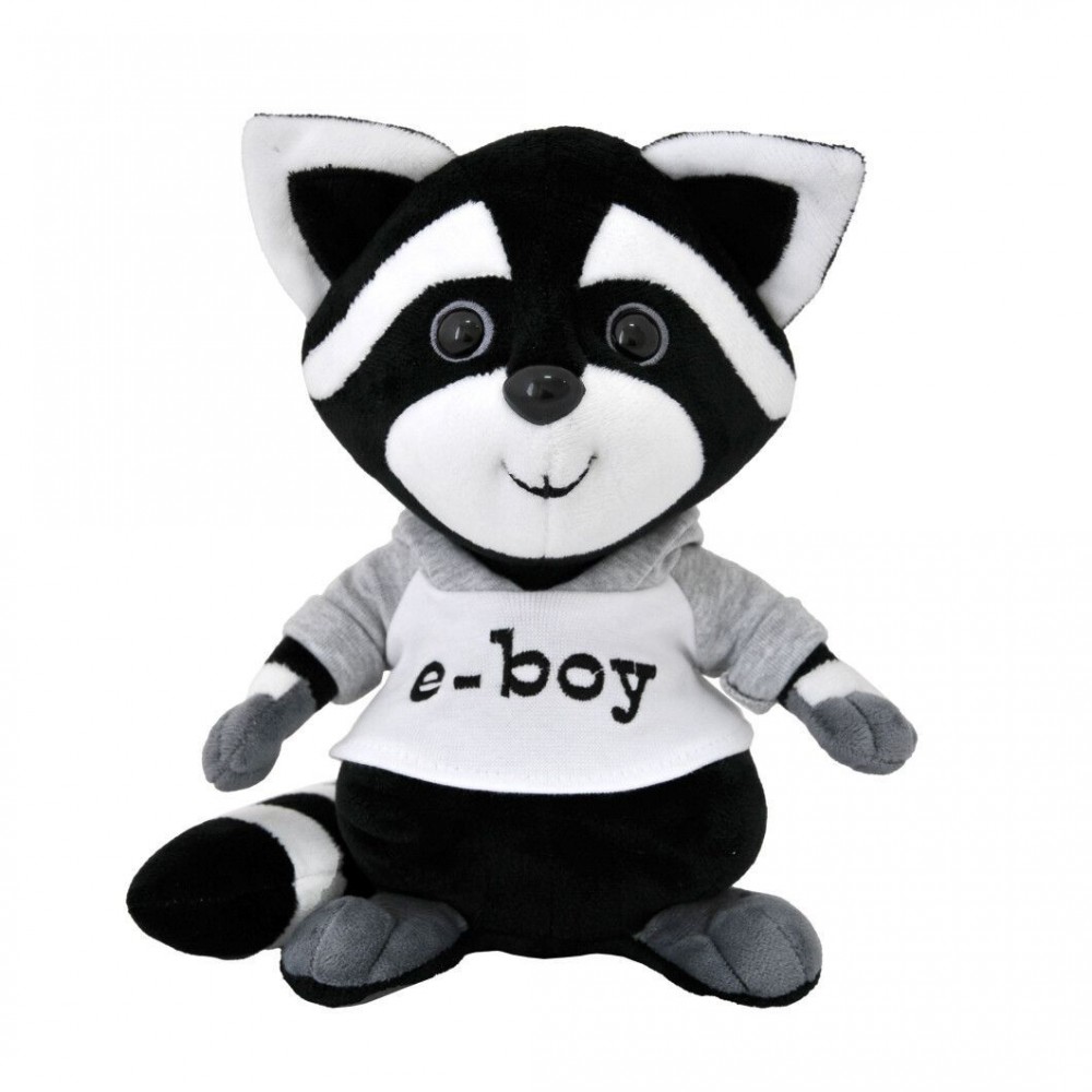 Милая плюшевая игрушка енота станет приятным подарком для ребенка. Мягкая и приятная на ощупь. Одета в красивую кофточку с надписью "e-boy". Выполнена из качественных и безопасных материалов. Для детей от 3-х лет. Размер игрушки 25х20 см.