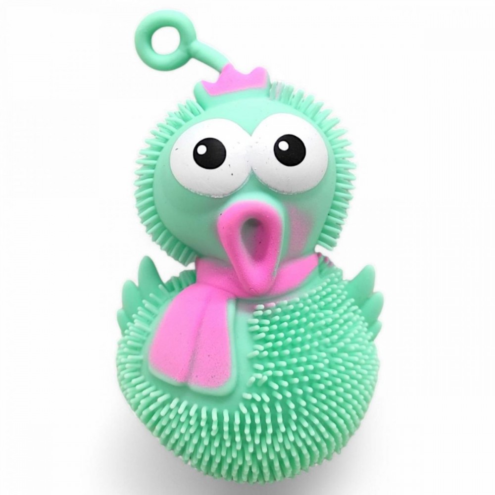 Забавная светяшка в виде лохматой курочки. Игрушка полая внутри и наполнена воздухом по типу надувного шара. Внутри игрушки также пластиковая светяшка, которая активируется при ударе о поверхность. Размер курочки – 11х7х6 см. Выполнено из качественных и безопасных материалов. Для детей старше 3-х лет. Если игрушка немного сдута, можно накачать ее с помощью обычного медицинского шприца с иглой (на игрушке есть специальное отверстие).