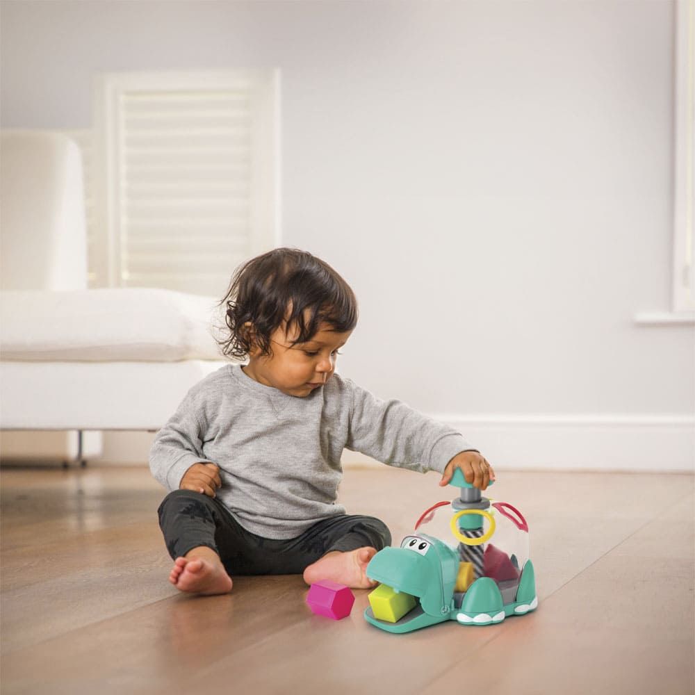 Симпатичная игрушка-сортер в форме бегемотика с улыбающимся лицом. В комплекте 4 разноцветные фигурки для сортировки. Ребенок вставляет фигурки в соответствующее отверстие и нажимает на поршень. Наблюдайте, как бегемотик весело их крутит и стреляет ими.