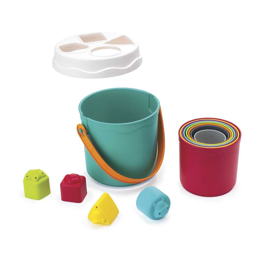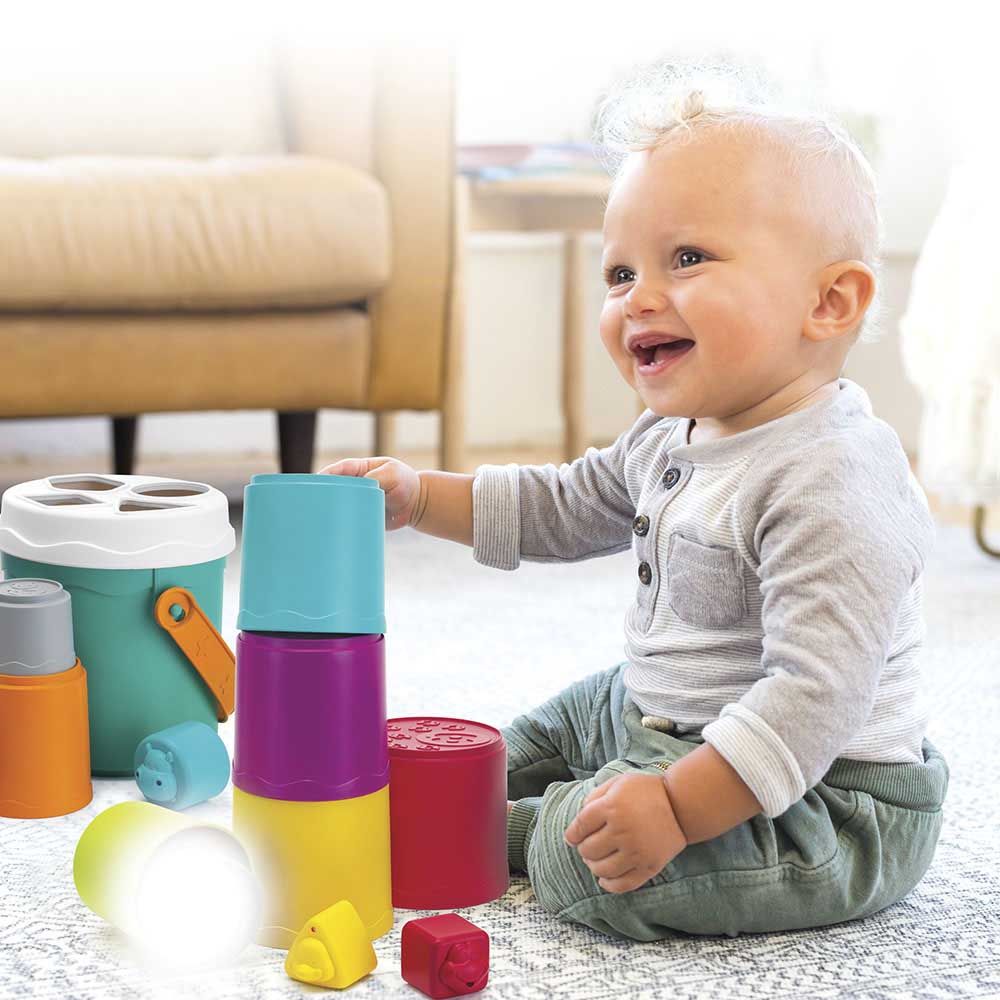 Развивающий сортер позволяет выстроить фигуры в высокую радужную башню, а затем разобрать ее, сортируя и перемещая фигуры в нужные отверстия через верх ведерка. Эта игра помогает развивать мелкую моторику и улучшать зрительно-моторную координацию.
