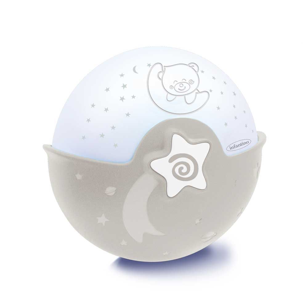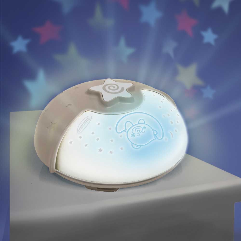 Светильник работает в 3-х режимах: Цветное свечение с проекцией звезд (LED), Синее успокоительное свечения (LED), Ночник. 6 мелодий и 3 звуки природы. Интеллектуальный датчик звука: активирует синее успокоительное свет, когда малыш шевелится. Регулятор громкости (3 уровня) Таймер сна - 10 минут. Элементы питания (3xAAA) не включены, рассчитанные на 40 часов автономной работы.