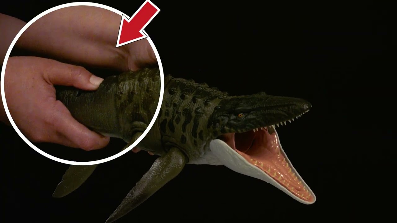 Управляйте хищной атакой! Держите Мозазавра за хвост и нажимайте на кнопку, чтобы активировать широкий захват пасти и "проглотить" мини-фигурку Дилофозавра (в комплекте) - она полностью помещается в большую пасть Мозазавра! Повторное нажатие на кнопку заставит динозавра "выплюнуть" добычу!
