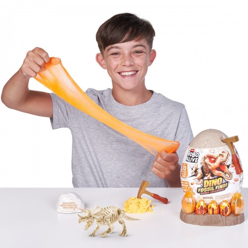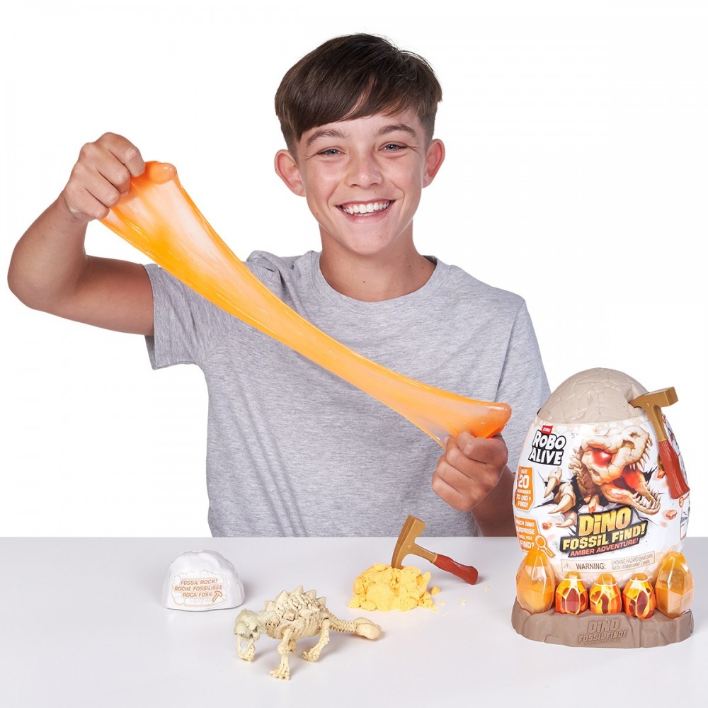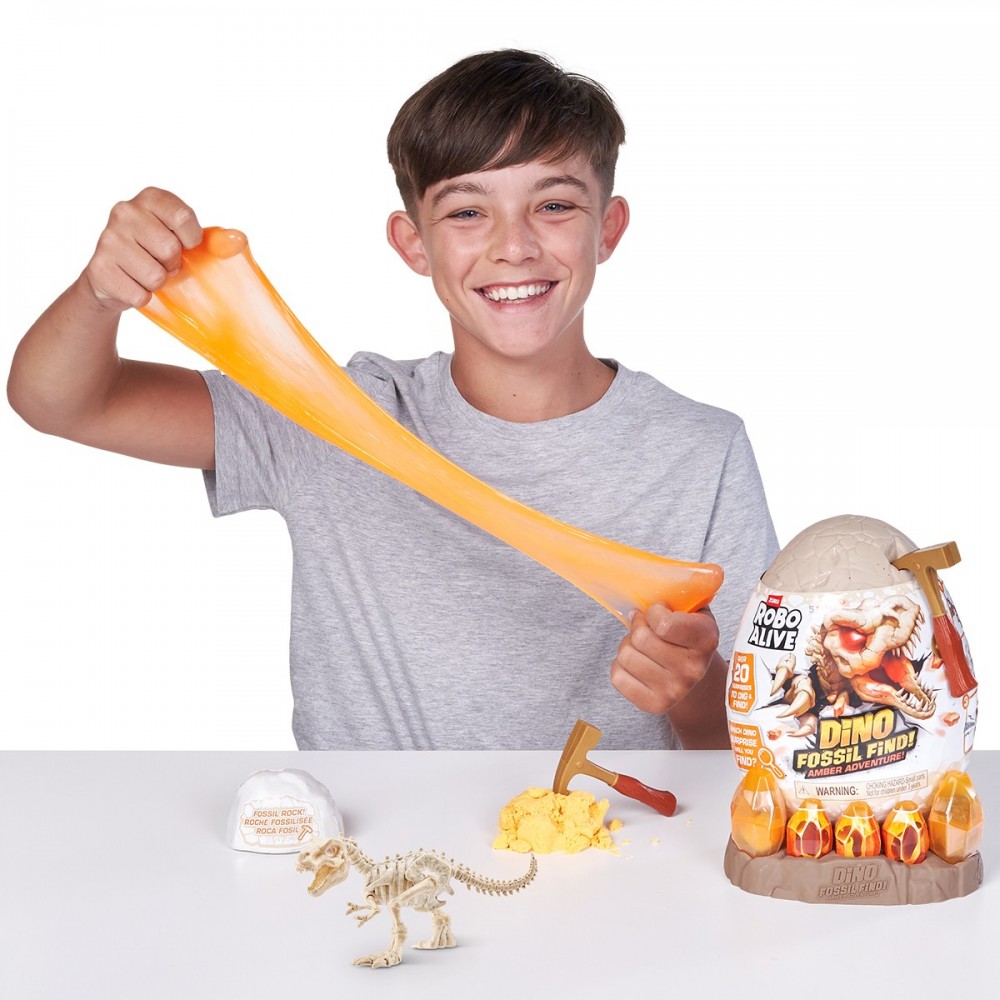 Интерактивный игровой набор-сюрприз ROBO ALIVE - ЯНТАРНЫЕ РАСКОПКИ ДИНОЗАВРА - замечательный подарок для маленьких поклонников динозавров и окаменелостей! Это огромное яйцо, внутри которого находятся спрятанные части скелета динозавра. Найдите все элементы - в слайме, в песке, в камне - и соберите скелет!
