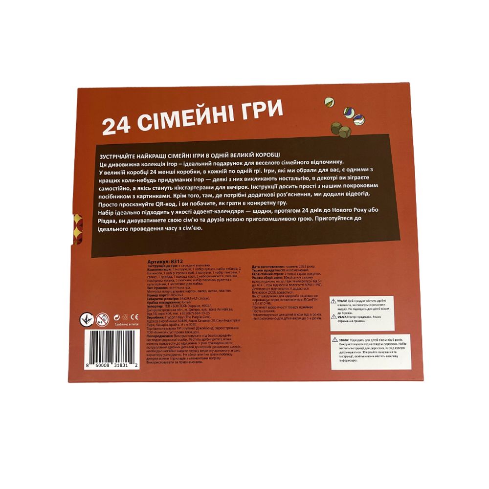 Календарь обратного отсчета 24 семейные игры - это удивительная коллекция игр которая ста идеальным подарком для веселого семейного отдыха. В большой коробке есть 24 коробки поменьше, в каждой по одной игре. Игры, которые мы выбрали для вас, являются одними из лучших когда-либо придуманных игр - некоторые из них вы, возможно, знаете, некоторые вызывают ностальгию, в некоторые вы будете играть самостоятельно, а некоторые станут кикстартерами для вечеринок. Инструкции довольно просты с нашим пошаговым руководством с картинками. Кроме того, там, где нужны дополнительные разъяснения, мы добавили видеогид. Просто просканируйте QR-код, и вы увидите, как играть в конкретную игру. Набор идеально подходит в качестве адвент-календаря - каждый день, в течение 24 дней до Нового Года или Рождества, вы будете удивлять свою семью и друзей (и себя) новой потрясающей игрой. Приготовьтесь к идеальному времяпрепровождению с семьей.