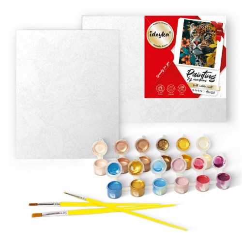 холст на подрамнике с галерейной натяжкой, бумажный дубликат с контурным рисунком картины (на картине нанесена схема контуров изображения с нумерацией), нейлоновые художественные кисти, палитра акриловых красок в контейнерах