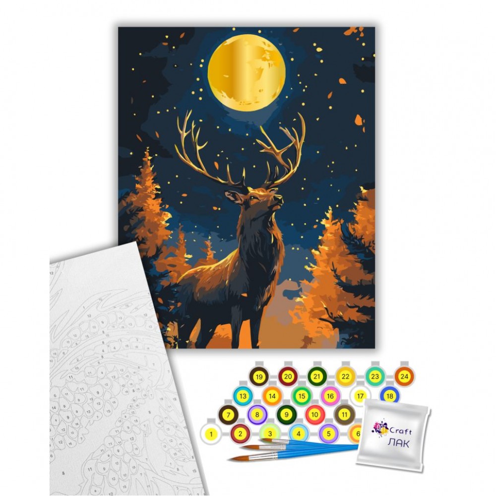 холст на подрамнике с галерейной натяжкой, бумажный дубликат с контурным рисунком картины (на картине нанесена схема контуров изображения с нумерацией), нейлоновые художественные кисти, палитра акриловых красок в контейнерах