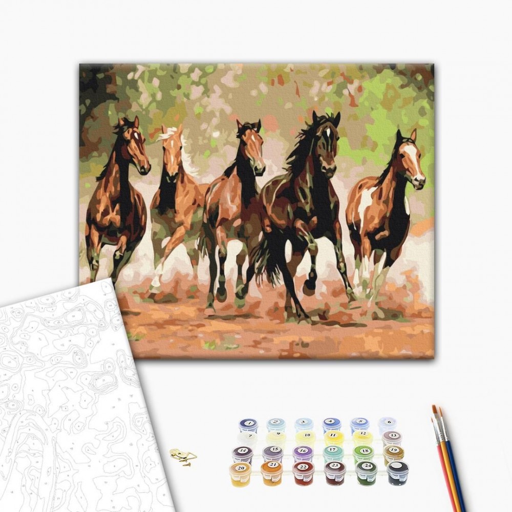 Для того, чтобы нарисовать картину, необходимо рисовать по пронумерованным контурам, которые соответствуют цвету краски. В наборе: натуральный холст на подрамнике с галерейной натяжкой, бумажная дубликат с контурным рисунком картины (на картине нанесена схема контуров изображения с нумерацией), 3 нейлоновые художественные кисти, палитра акриловых красок в контейнерах, крепление. Все необходимые краски уже в комплекте и не требуют смешивания. Размер: 48 х 60 см.