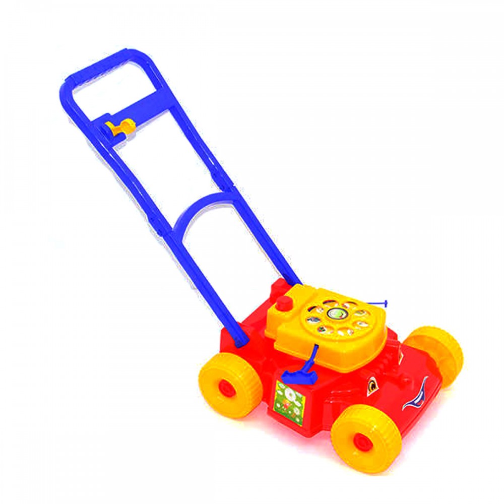 Пластиковая каталка с раскладной длинной ручкой (47 см) в виде газонокосилки. Также в ней есть запускной механизм, запускающий колёсико._