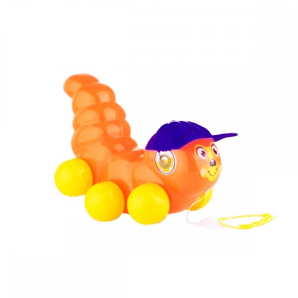 Пластиковая каталка в виде гусеницы с ручкой на верёвочке. При движении - крутятся "лапки-колёсики"._