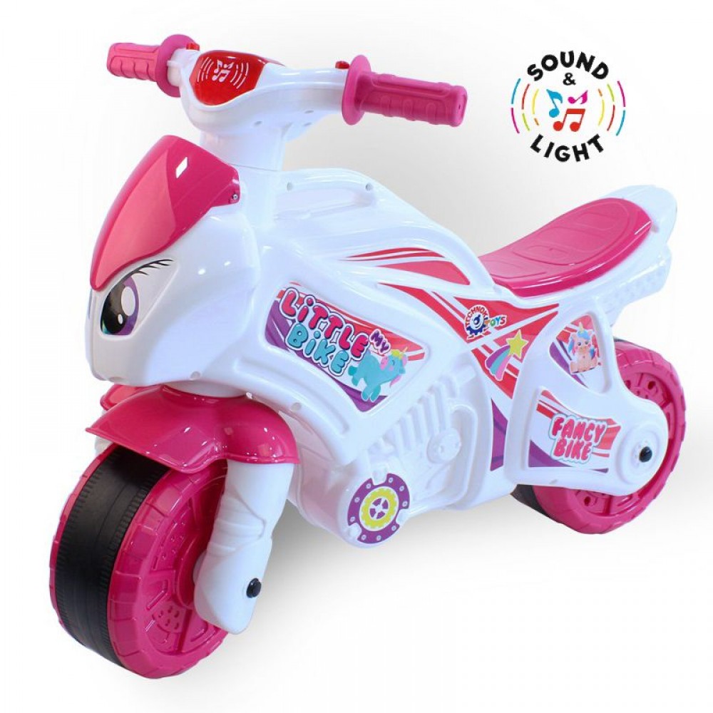 Каталка-мотоцикл со световыми и звуковыми эффекты. На руле каталки расположены две кнопки. При нажатии на одну из кнопок, ребёнок, услышит различные варианты звучания. Вместе с этим, каталка имеет световые эффекты. Сделана из качественного пластика._