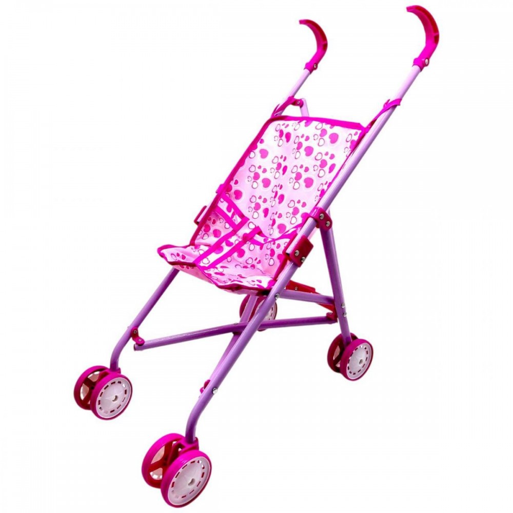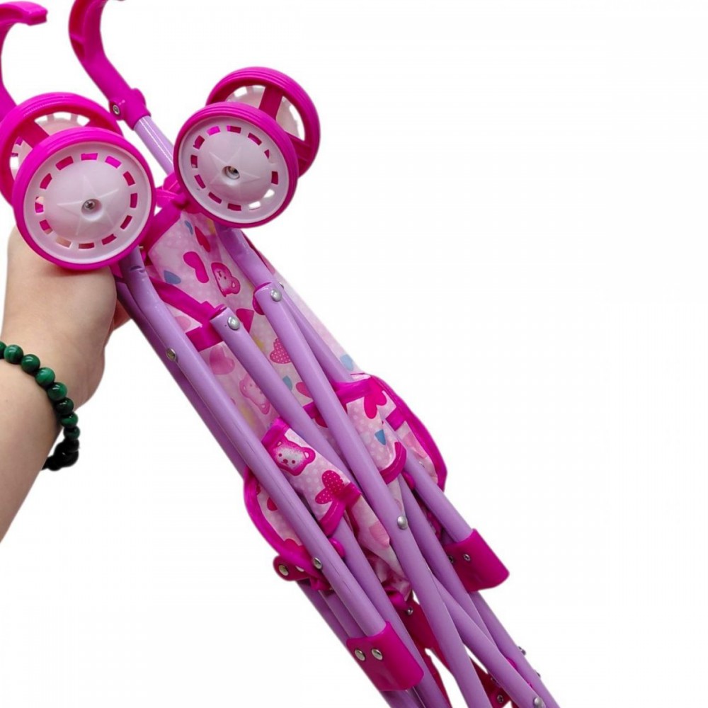 Коляска-трость для кукол выполнена в розовом цвете с декоративным принтом в виде сердечек. Каркас изготовлен из металла, сиденья – из текстильного материала. Конструкция легко складывается, что делает хранение и транспортировку удобной.