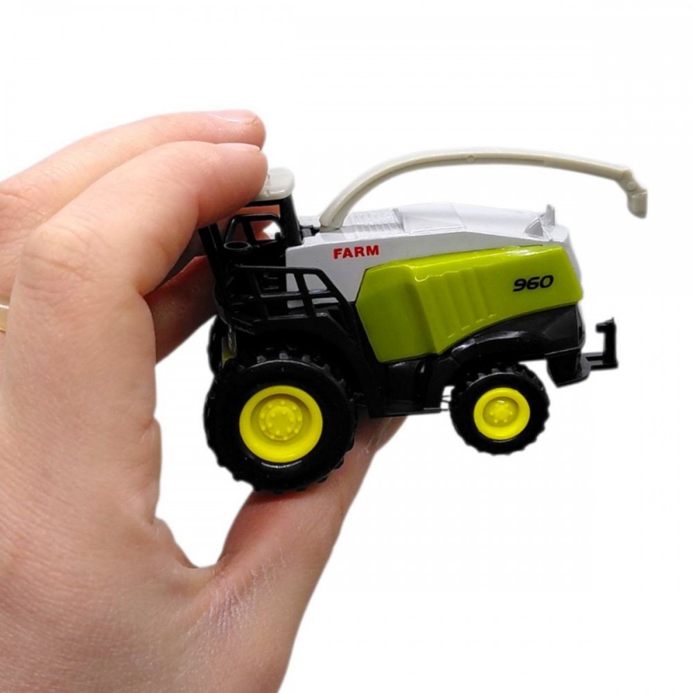 Игрушечный комбайн выполнен в реалистичном стиле с характерными элементами сельскохозяйственной техники. Модель имеет металлическое основание, которое обеспечивает прочность и долговечность в использовании. Колеса свободно вращаются, что позволяет легко перемещать технику во время игры.