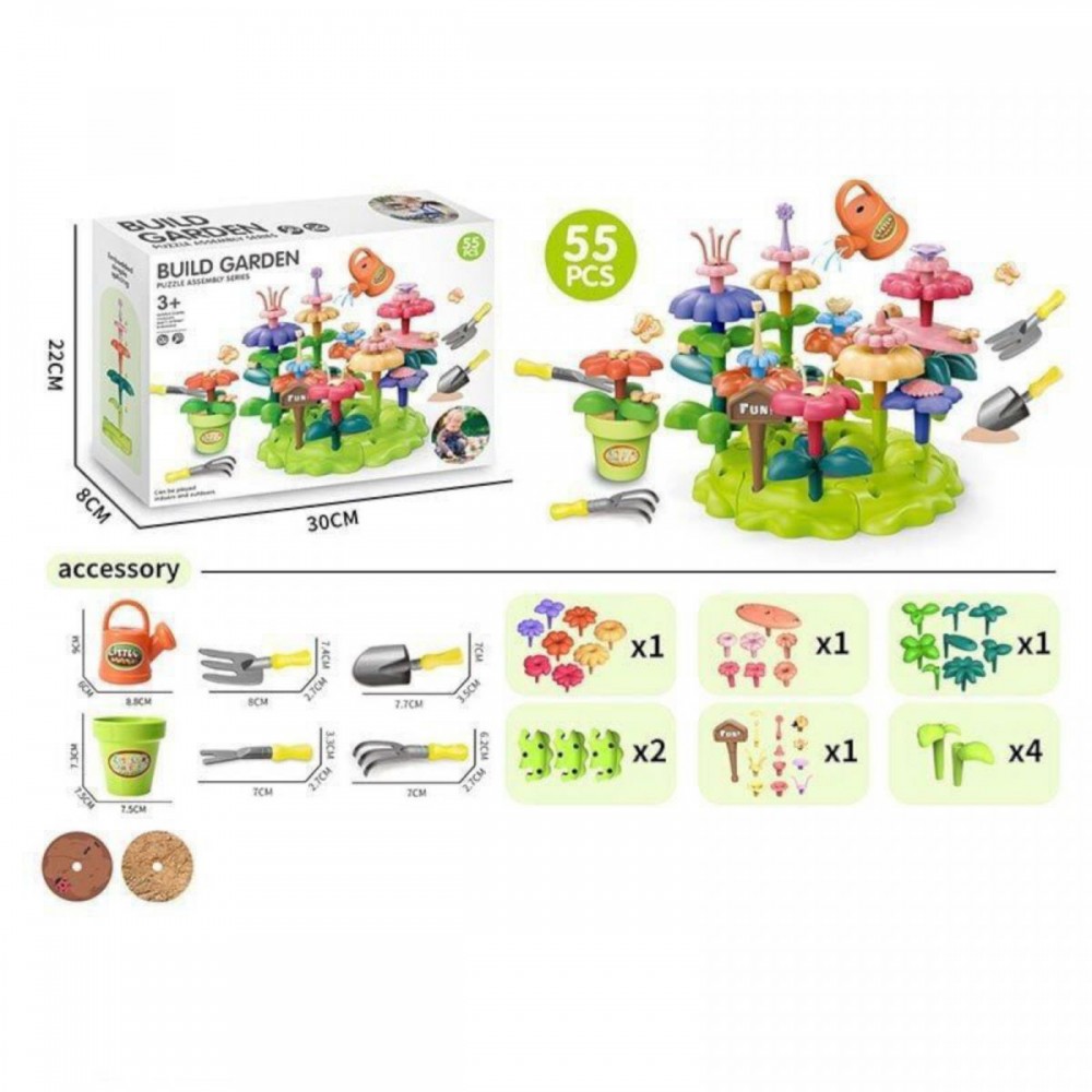 Интернет-магазин eToys предлагает вашему вниманию товар "Конструктор "Цветочный сад", набор садовода, 55 элементов, грабли, лопата, вила, лейка, вазон, цветы, в коробке" по цене 505 грн..