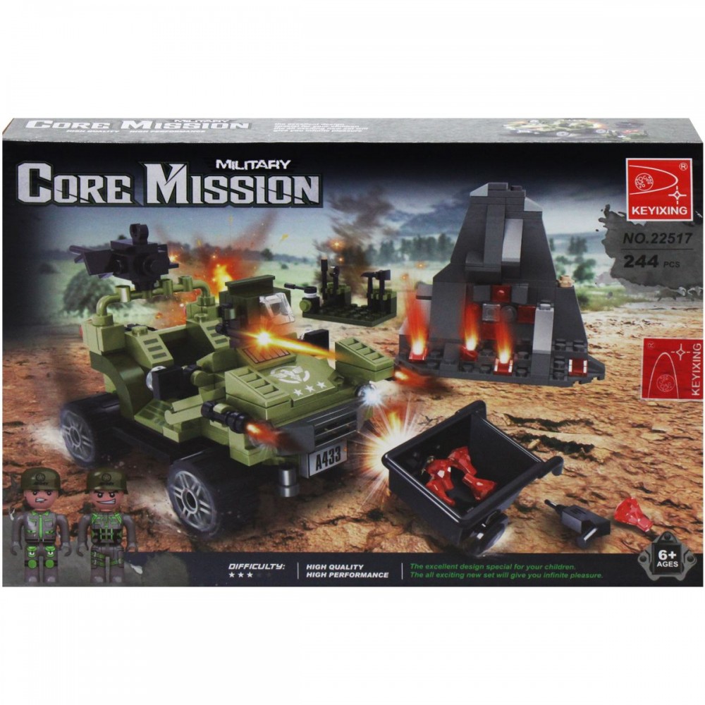 Конструктор основная военная миссия. Состоит из 244 деталей. Уровень тяжести сборки 3/5. Конструктор изготовлен из качественных материалов. Состоит из машины, станции и повозки. Машина имеет некоторые движущиеся части. Подойдет любителям конструирования._