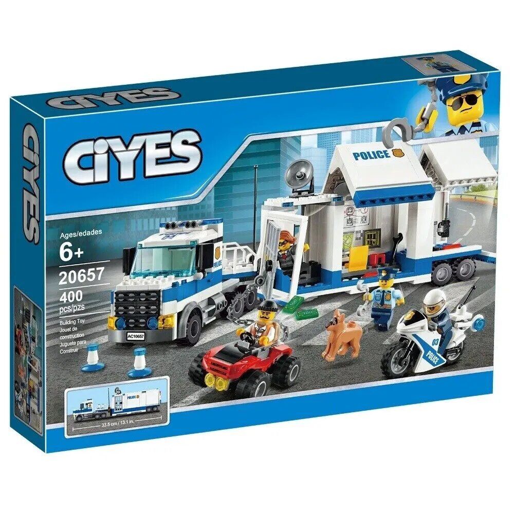 Большой пластиковый конструктор "Cities", с которым ребенок сможет собрать эпичную сцену погони за преступниками: фигурки персонажей, транспорт и декоративные элементы. Детали конструктора выполнены из качественного и прочного пластика. Длина полицейского грузовика в собранном виде - 35.5 см. Для детей от 6-ти лет.