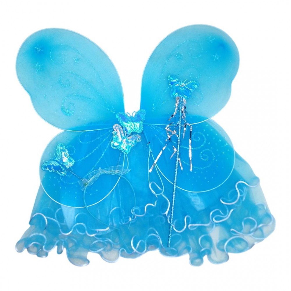 Красивый костюм для настоящей феи. В набор входят: яркие цветные крылья на резинках (48 х 37,5 см), юбочка, палочка и обруч с двумя блестящими бабочками на пружинках. Ширина резинки юбочки в нерастянутом виде 20 см, длина юбки общая 30 см. Такой комплект станет отличным дополнением костюма на праздник и поможет ребенку выделиться.