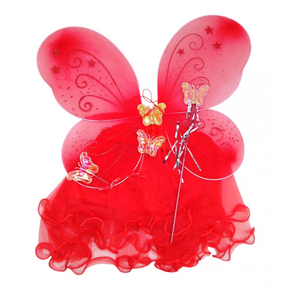 Красивый костюм для настоящей феи. В набор входят: яркие цветные крылья на резинках (48 х 37,5 см), юбочка, палочка и обруч с двумя блестящими бабочками на пружинках. Ширина резинки юбочки в нерастянутом виде 20 см, длина юбки общая 30 см. Такой комплект станет отличным дополнением костюма на праздник и поможет ребенку выделиться.
