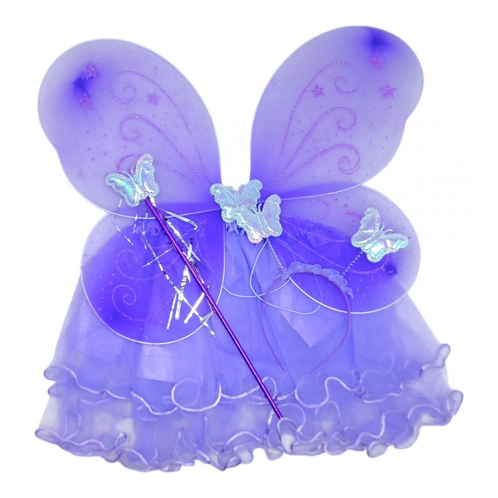 Красивый костюм для настоящей феи. В набор входят: яркие цветные крылья на резинках (48 х 37,5 см), юбочка, палочка и обруч с двумя блестящими бабочками на пружинках. Ширина резинки юбочки в нерастянутом виде 20 см, длина юбки общая 30 см. Такой комплект станет отличным дополнением костюма на праздник и поможет ребенку выделиться.
