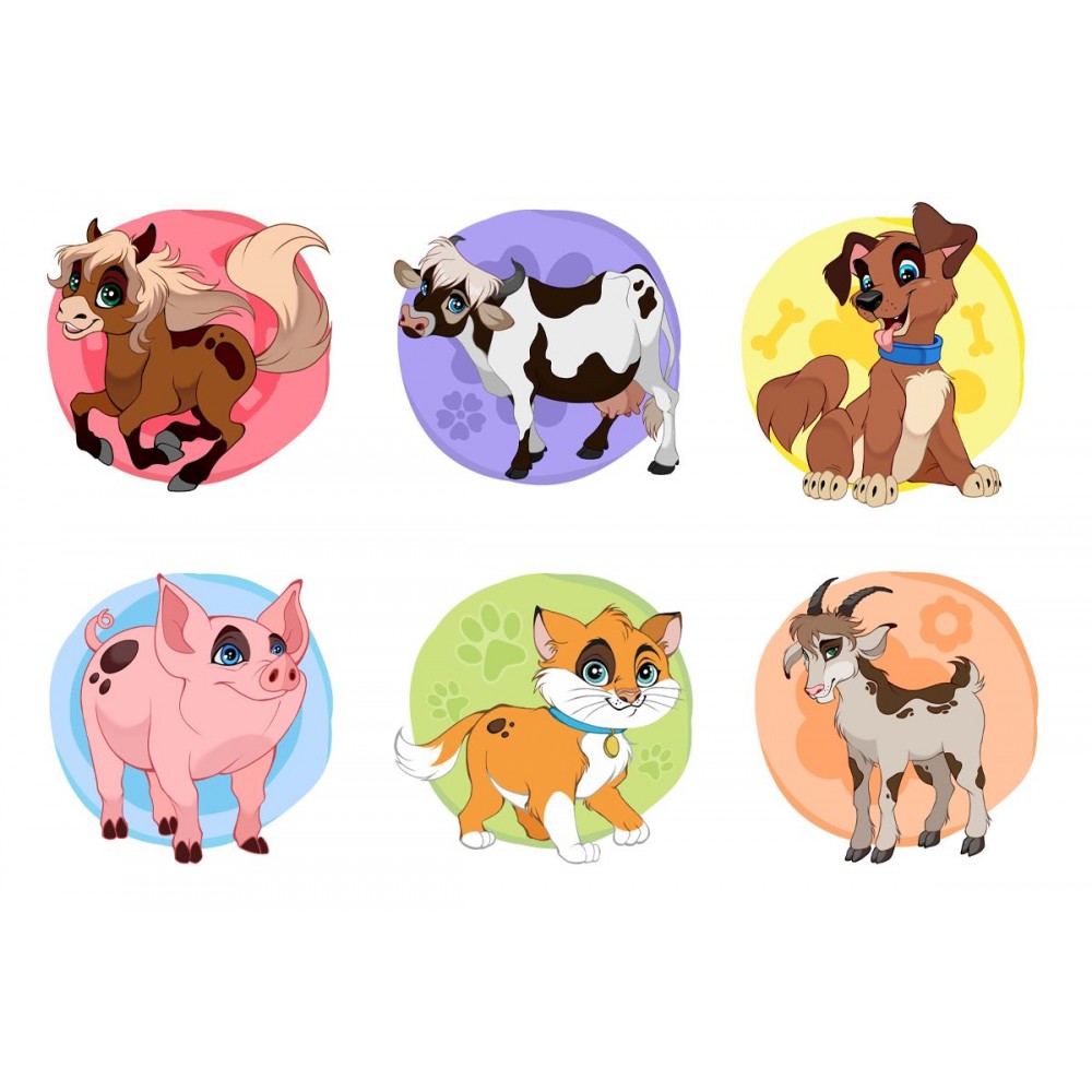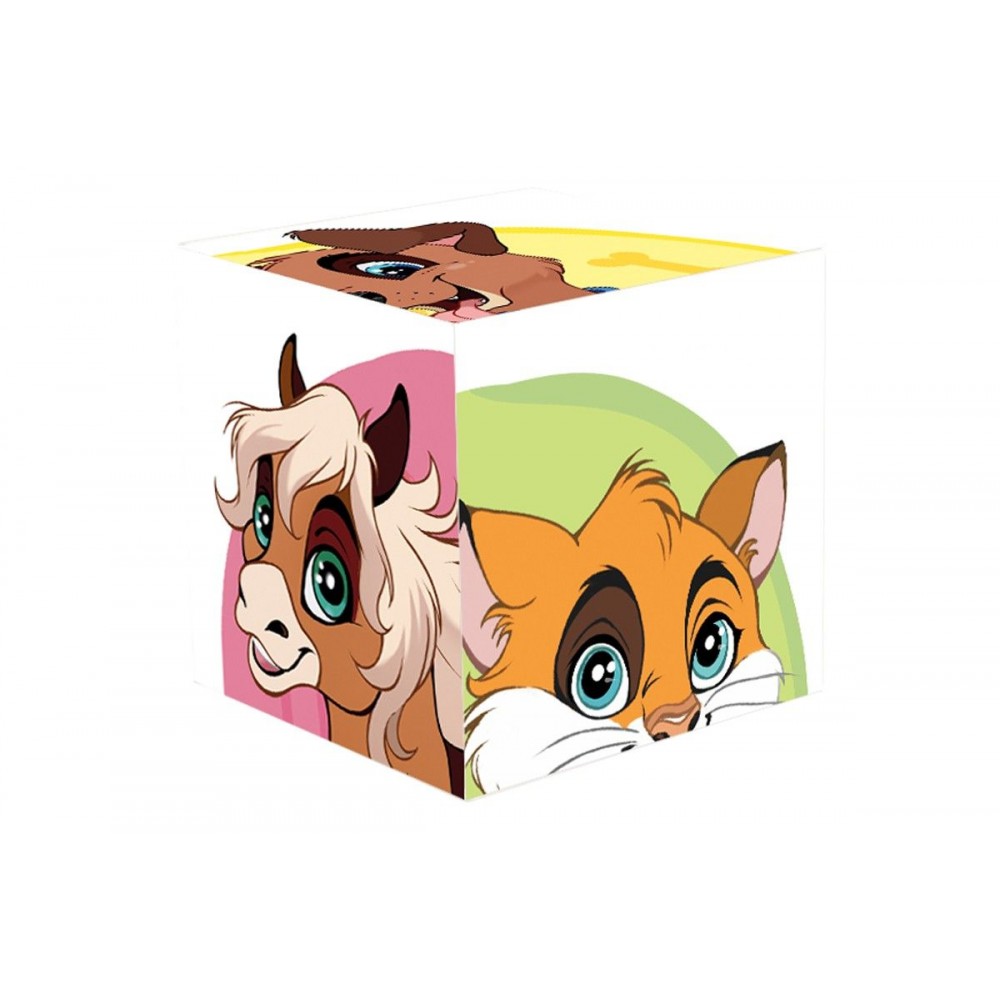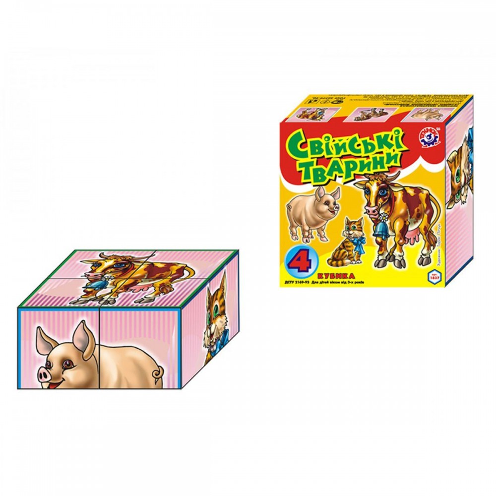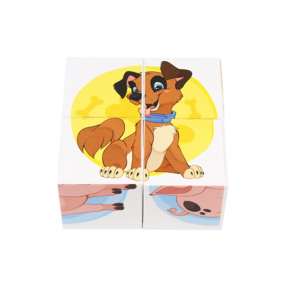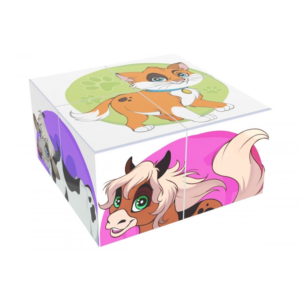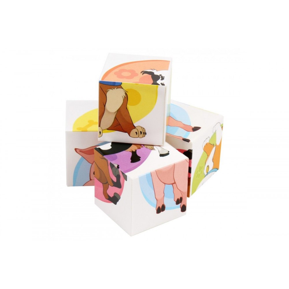 4 ярких пластиковых кубика. На каждой из граней – фрагменты изображения домашних животных, которые нужно собрать в один рисунок. 6 разных картинок: кошка, собака, коза, свинка, лошадка и корова. Размер одного кубика: 4х4 см.
