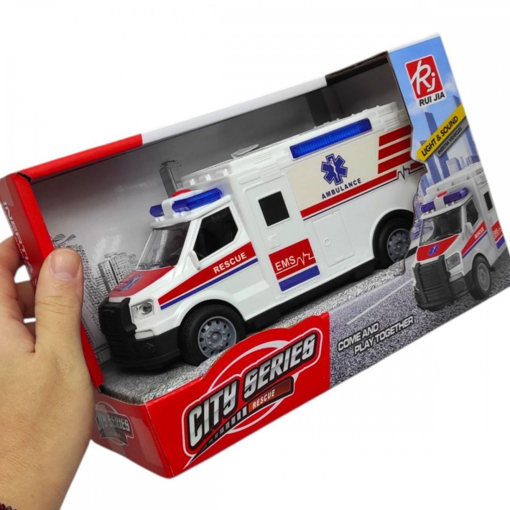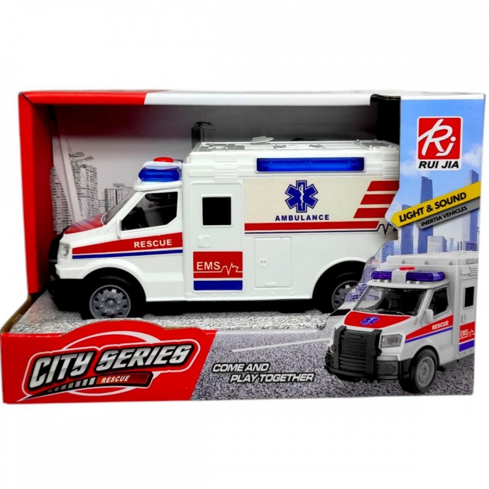 Интернет-магазин eToys предлагает вашему вниманию товар "Машина інерційна "Швидка допомога" озвучена, зі світлом, в коробці (23x10,5x15 см)" по цене 403 грн..