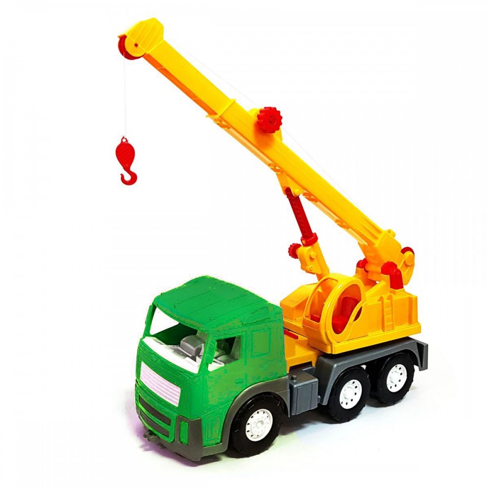 Машина строительная "Автокран Акрос". Имеет подвижные элементы: башня крана, стрела (поднимается, опускается, выдвигается), барабан. 3 механизма управления: подъем стрелы, выдвижение стрелы, регулировка "тросов". Высокая детализация, качественный пластик._