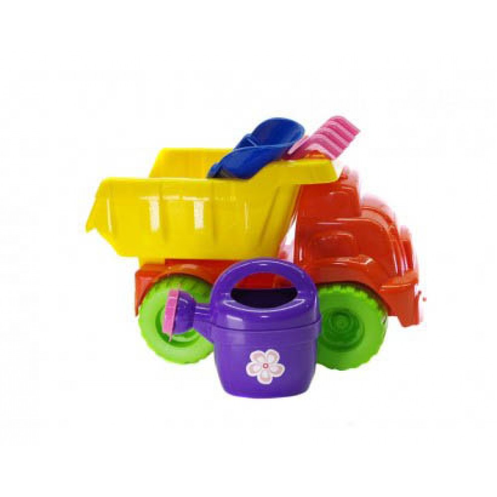 Яркая пластиковая машинка грузовик с откидным кузовом. Также в наборе идёт леечка, лопатка и грабельки. У грузовика большие колёса. Спереди есть "петелька" для верёвочки._