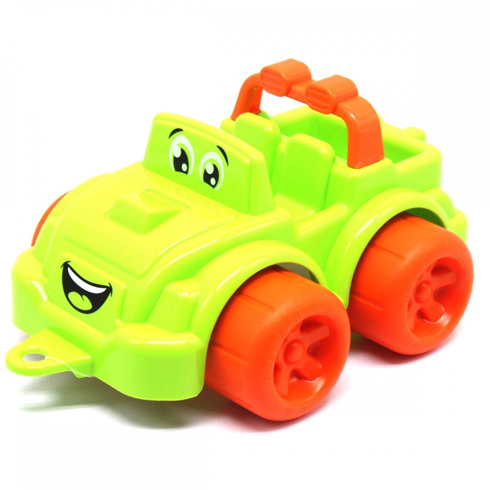 Яркая пластиковая машинка с изображением забавного личика. Имеет петельку для верёвочки._