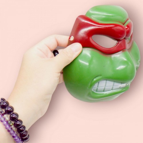 Маска будет хорошим дополнением костюма на детский праздник. Сделана в виде героя популярного комикса и мультсериала "Черепашки Ниндзя". Размер - 18,5х9х18 см. Крепится при помощи резинки. Выполнена из легкого пластика, полностью безопасна для ребенка и комфортна в ношении.