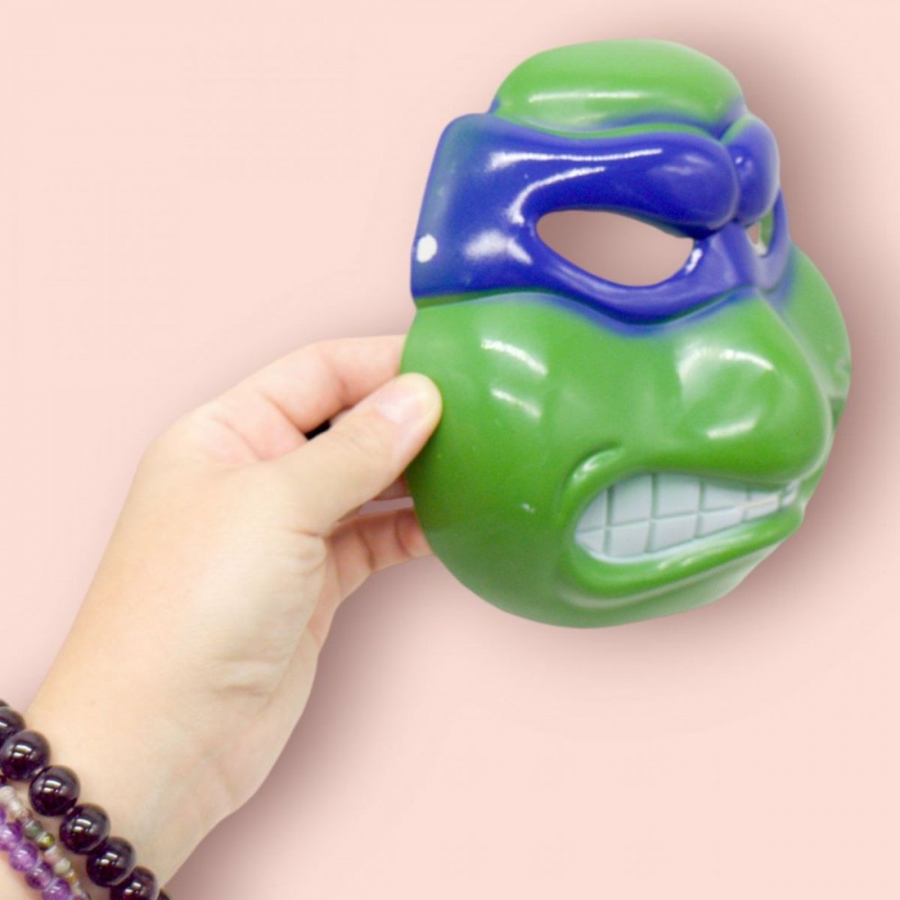 Маска будет хорошим дополнением костюма на детский праздник. Сделана в виде героя популярного комикса и мультсериала "Черепашки Ниндзя". Размер - 18,5х9х18 см. Крепится при помощи резинки. Выполнена из легкого пластика, полностью безопасна для ребенка и комфортна в ношении.