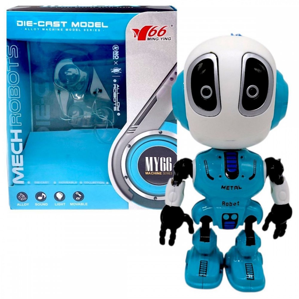Корпус сочетает в себе пластиковые и металлические элементы. Робот имеет подвижные части и компактный размер удобен для детских рук. Работает от батареек.