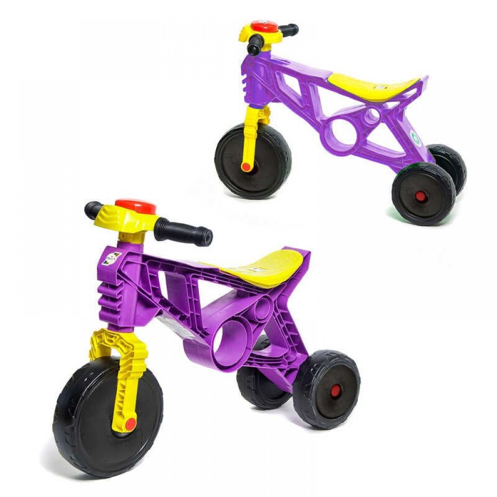 Легкий и практичный в управлении велобег «Мотоцикл» – идеальный вариант для детей, которые уже очень подвижны, но для велосипеда еще не подросли. Orion 171 – это удобная модель велобега, напоминающая трехколесный велосипед, но без педалей. Спереди – одно большое колесо и сзади – поменьше. Конструкция очень устойчива, а благодаря тому, что нет педалей и передвигать велосипед нужно, толкаясь ногами, мускулатура детских ног активно развивается и укрепляется. Руль оснащен клаксоном и рифлеными рукоятками, за которые очень удобно держаться. Для производства велобега производитель использует только качественный пластик.