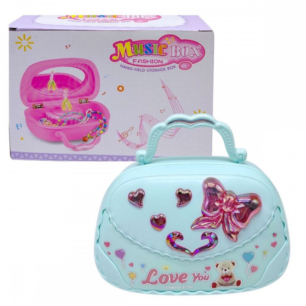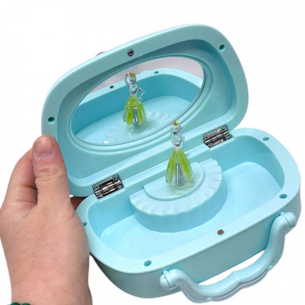 Красивая музыкальная шкатулка, украшена милым рисунком и бантиком. Заводится вручную при помощи механизма, который запускает мелодию. Внутри есть фигурка балерины, которая вращается на специальном механизме. У шкатулки есть зеркальце и одно отделение. Выполнена из качественного и безопасного пластика. Размер 16х8х10 см.